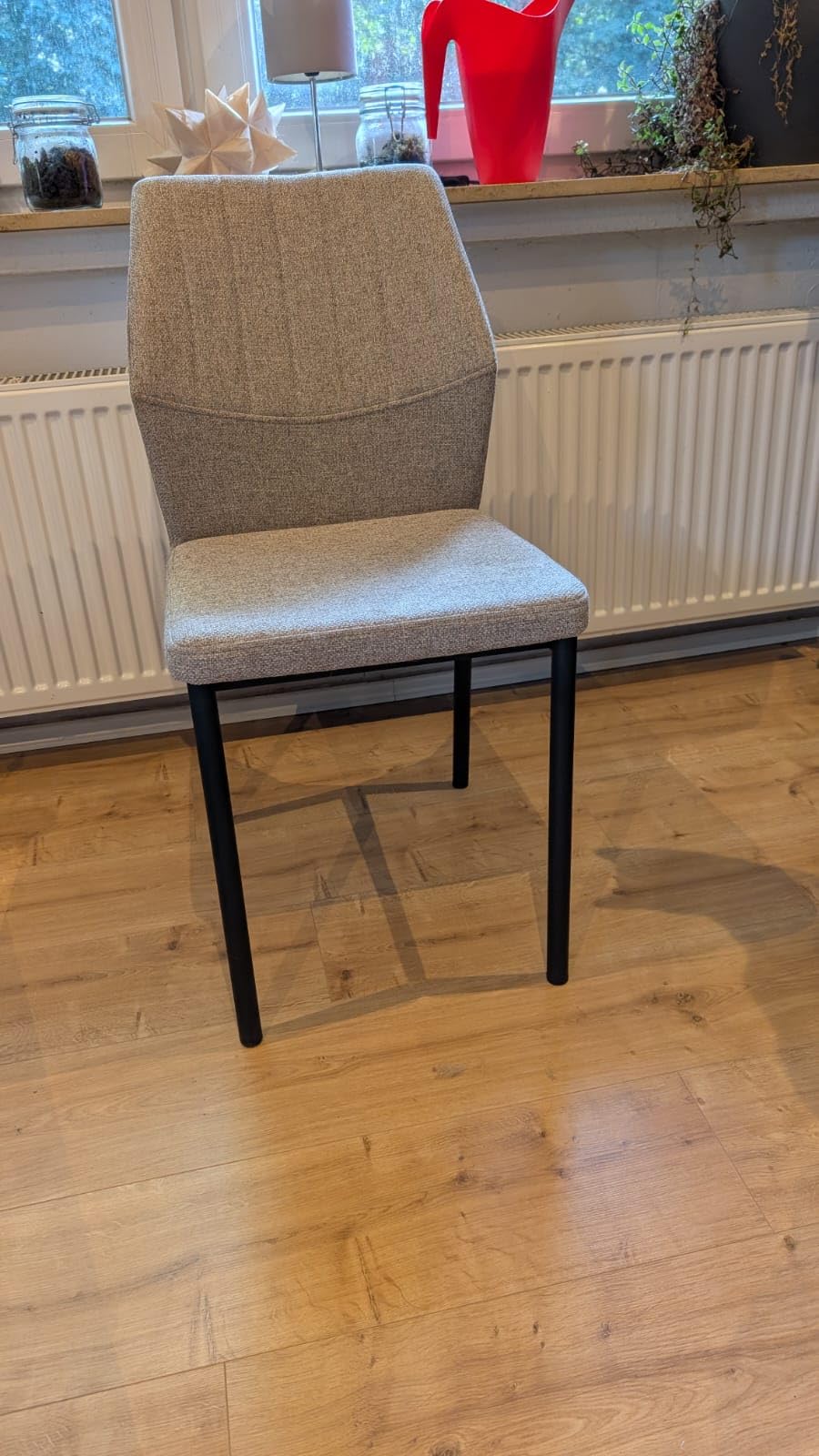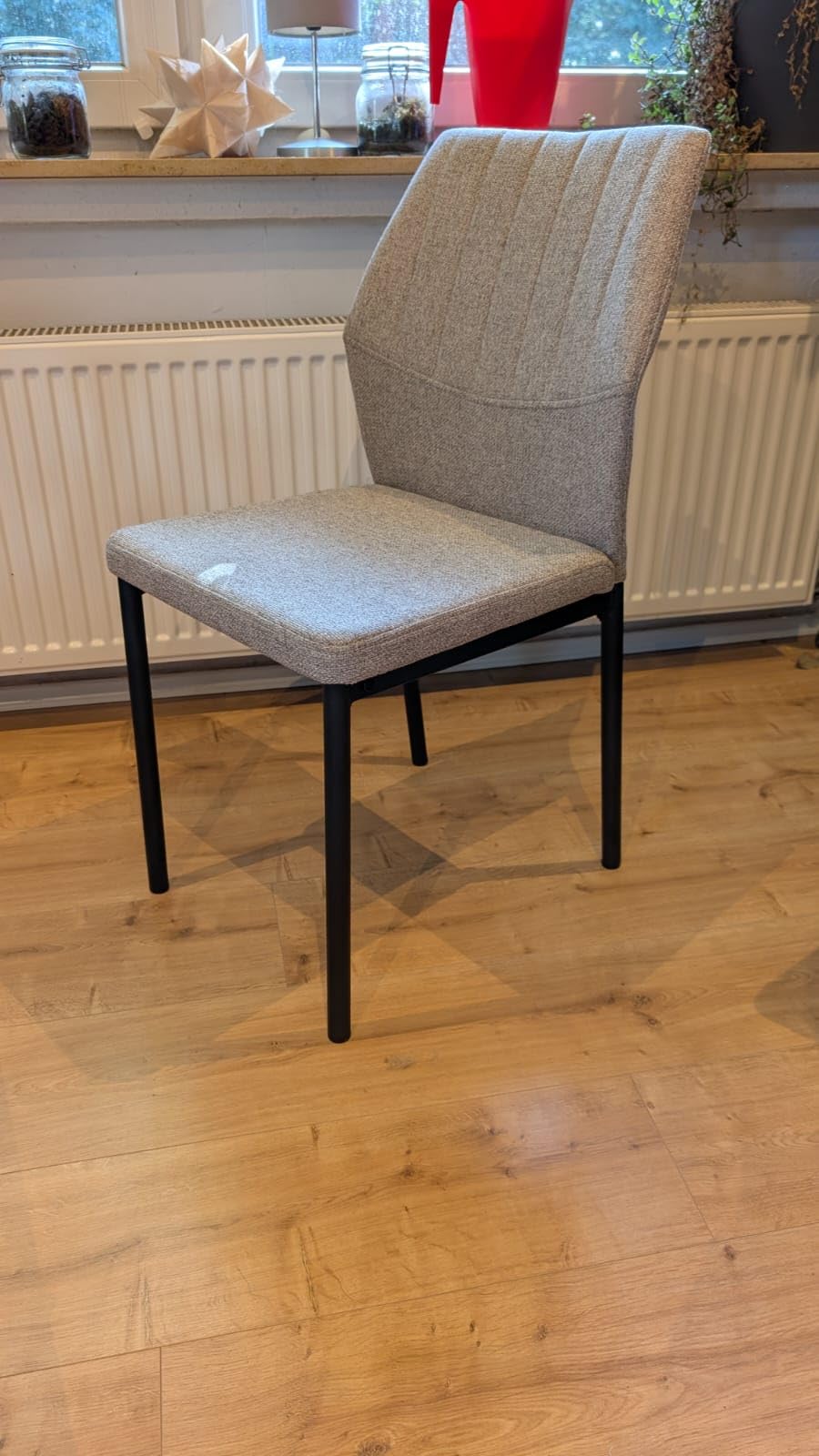 Die Stühle sind im Handumdrehen zusammen gebaut. Sie sind sehr stabil und nichts wackelt. Die Sitzfläche ist sehr schön gepolstert, genauso wie die Rückenlehne, so dass auch längere Sitzen kein Problem ist. Sowohl die Sitzfläche als auch die Rückenlehne hat die perfekte Länge, sodass diese nicht zu wuchtig im Raum aussehen. Generell sehen diese sehr modern und schlicht aus und fügen sich perfekt in jede Einrichtung ein