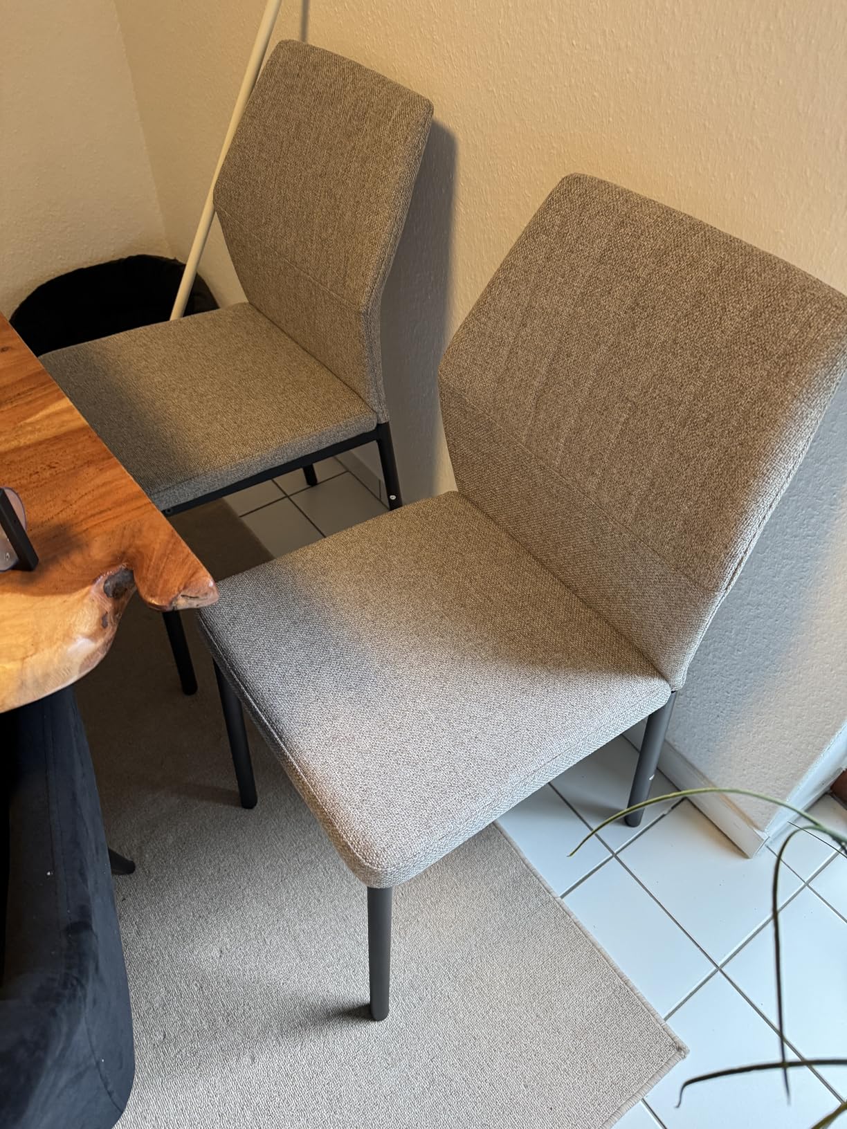 Ich habe die Esszimmerstühle in Beige als 2er-Set für den Küchentisch gekauft und bin bisher sehr zufrieden damit. Die Lieferung kam pünktlich und war ordentlich verpackt, nichts war beschädigt. Der Aufbau ging leicht von der Hand. Die Anleitung war verständlich, und man braucht kein besonderes Werkzeug oder handwerkliches Geschick. Nach etwa 10 Minuten standen beide Stühle fertig aufgebaut im Esszimmer.Optisch gefallen sie mir richtig gut. Das Beige ist ein warmer, neutraler Ton, der sich gut mit anderen Möbeln kombinieren lässt. Der Stoff fühlt sich angenehm an und sieht auch nach ein paar Wochen Benutzung noch aus wie neu. Die Polsterung ist bequem und man sitzt auch bei längeren Mahlzeiten oder beim Arbeiten am Tisch noch bequem.Die Stühle stehen stabil und machen insgesamt einen soliden Eindruck, d.h. nichts wackelt oder quietscht. Für den Preis finde ich die Qualität wirklich überzeugend.Ein kleiner Hinweis: Für große Menschen könnten die Stühle eventuell etwas niedrig oder kompakt wirken. Für durchschnittliche Körpergrößen sind sie aber ideal.Ich würde sie auf jeden Fall wieder kaufen und kann sie jedem empfehlen, der nach schlichten, bequemen und gut verarbeiteten Stühlen sucht.